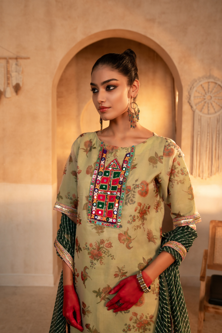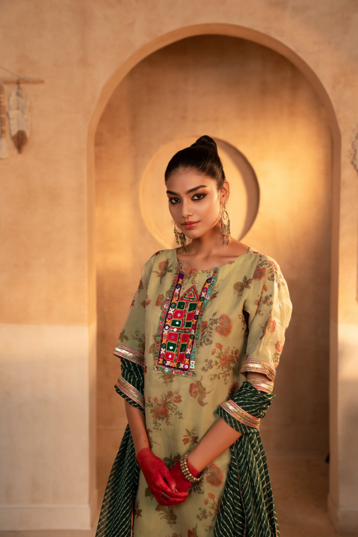 Shaded Hara Hara Kurta Set with Silk Pants and Organza Embroidery