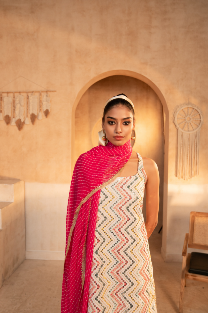 Embrace the timeless elegance of the Tammanna - Safed Ishq Sharara Set. Crafted from the luxurious georgette fabric, this stunning ensemble features a serene white hue that radiates a sense of purity and grace. The sharara silhouette, with its flowing and flared legs, creates a mesmerizing look that will leave a lasting impression. Whether you're attending a special occasion or elevating your everyday style, this Tammanna creation is a versatile choice that will make you feel truly captivating.