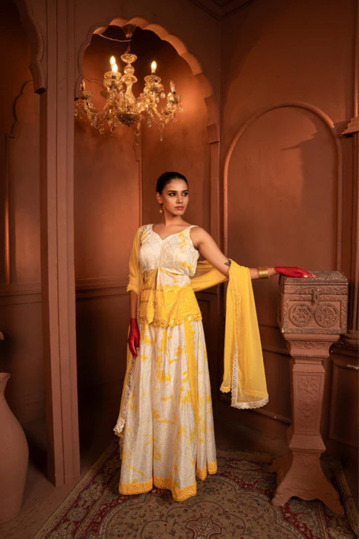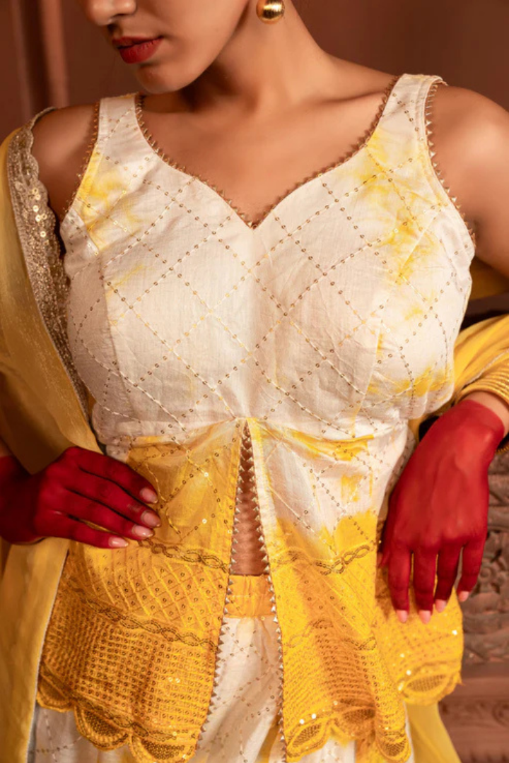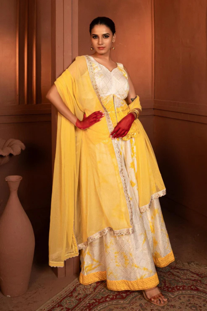 Find your Sukoon (peace) in this beautiful Chanderi silk kurta sharara set by Tammanna. The combination of a graceful kurta with flowing sharara pants offers both comfort and style for various occasions.