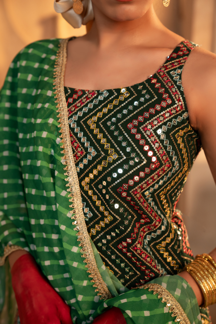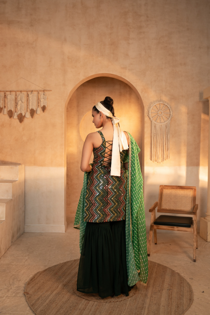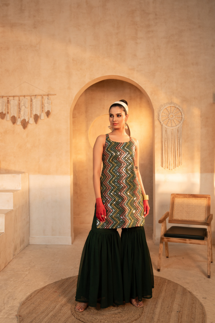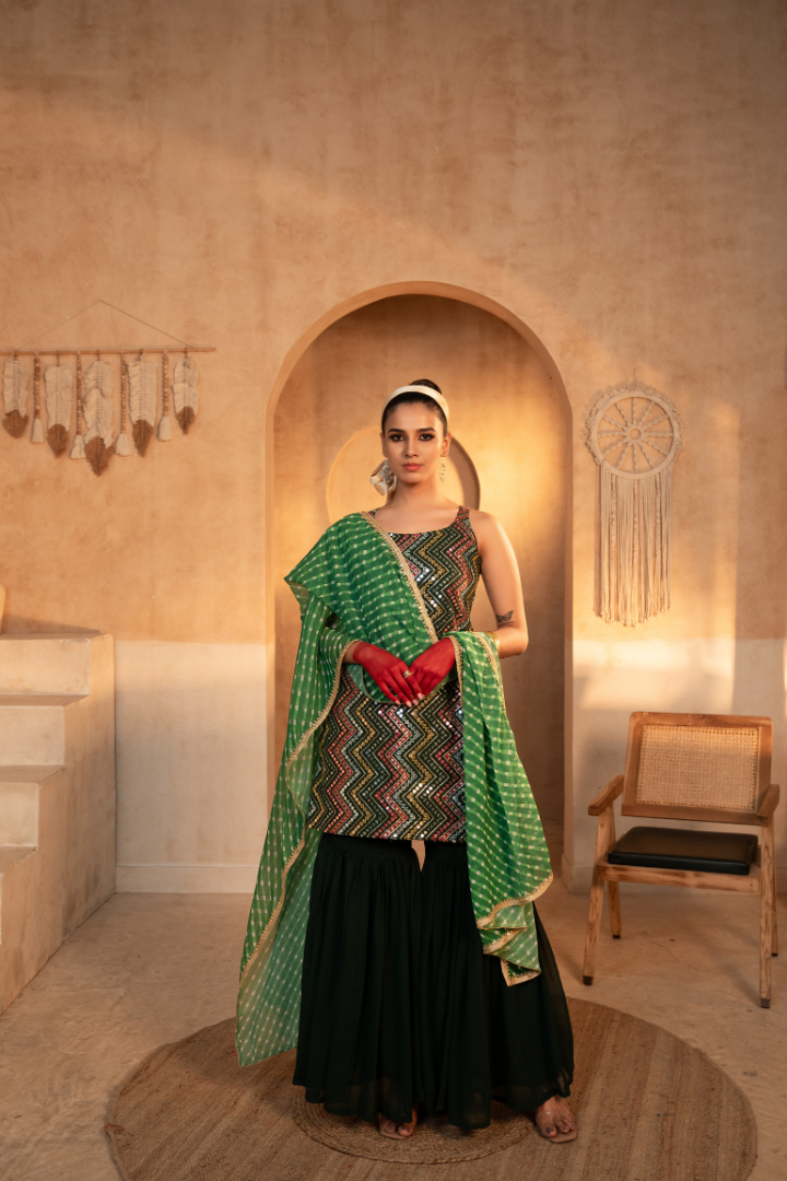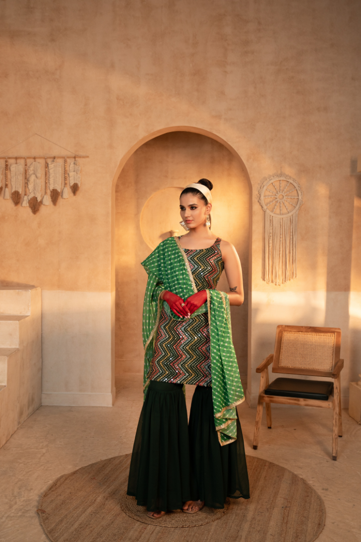 Embrace the spicy charm of the Tammanna - Teekhi Mirch Sharara Set. Crafted from the luxurious georgette fabric, this stunning ensemble features a captivating red hue that radiates an aura of confidence. The sharara silhouette, with its flowing and flared legs, creates a mesmerizing look that will leave a lasting impression. Whether you're attending a festive celebration or elevating your everyday style, this Tammanna creation is a versatile choice that will make you feel truly remarkable.