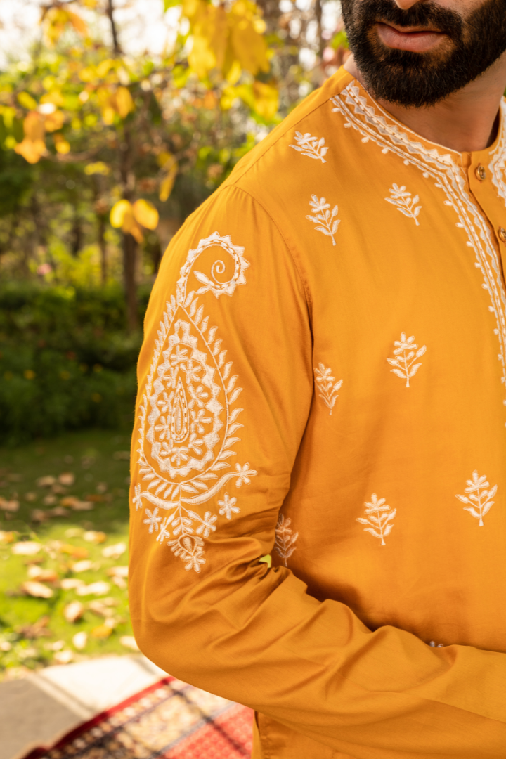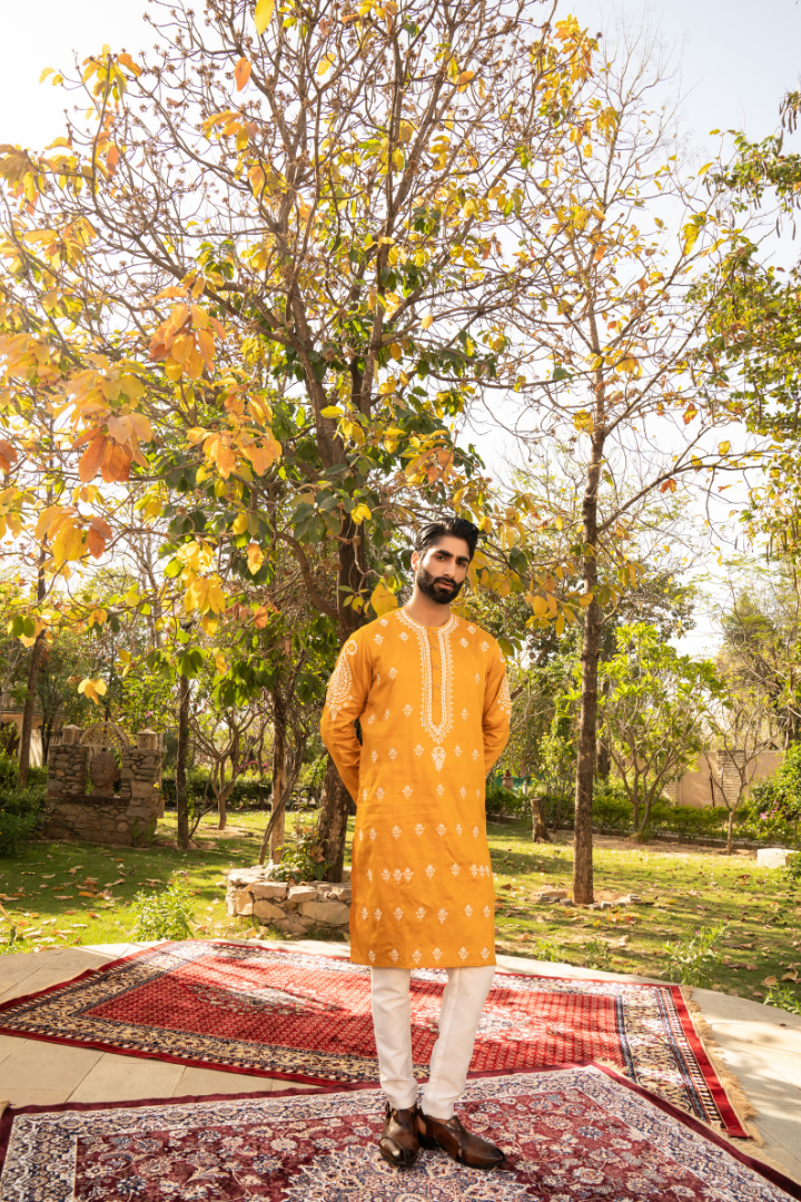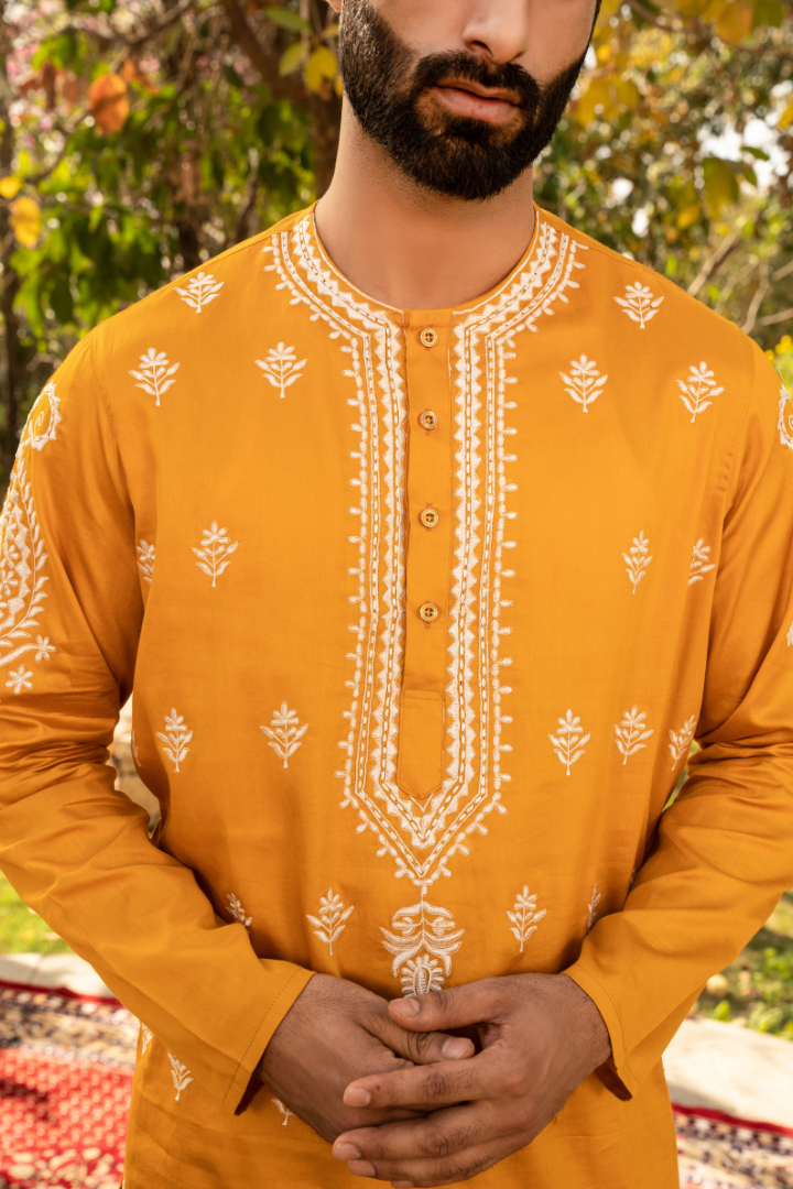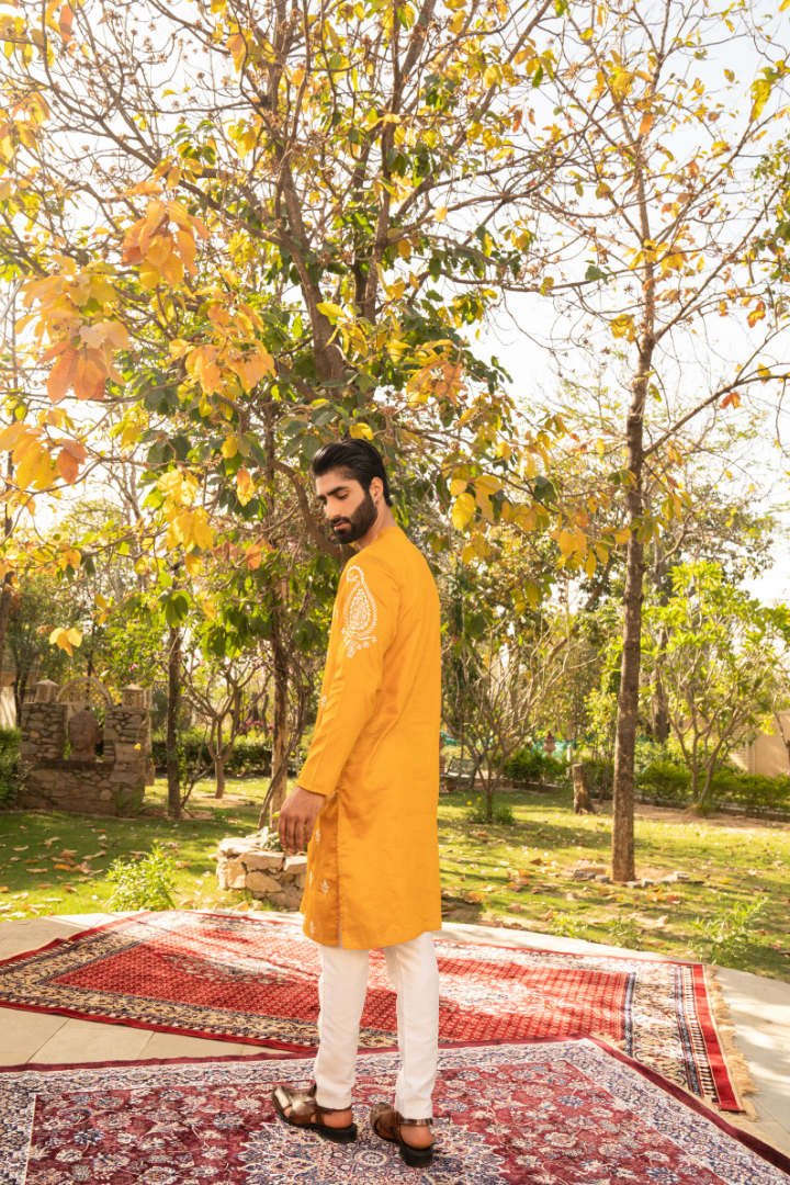 Brighten up your day with this vivid banana yellow kurta. The solid, cheerful color is reminiscent of ripe bananas, bringing a pop of sunshine to your traditional wear collection.