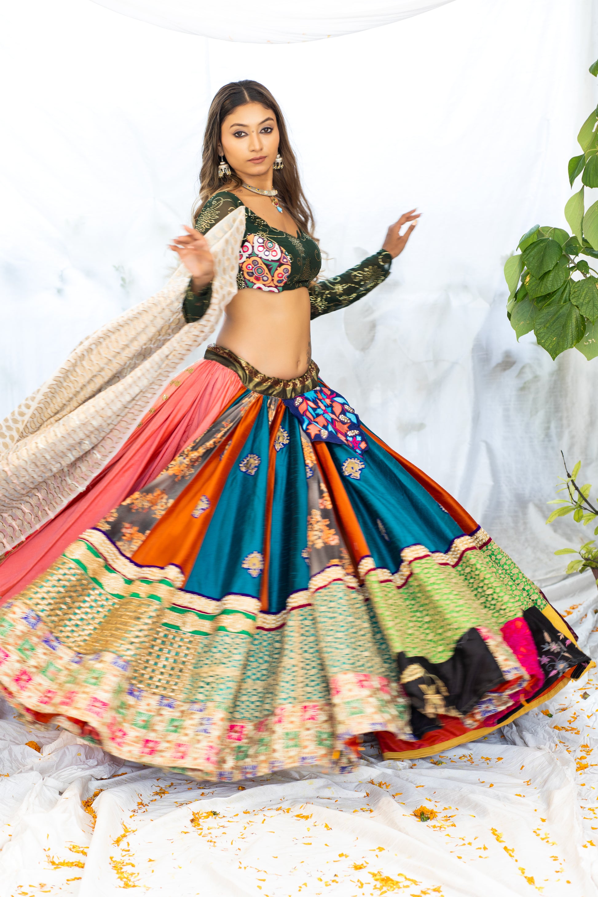Vibrant Handcrafted Lehenga with Kutchi Embroidery, Blouse, and Border Dupatta Set