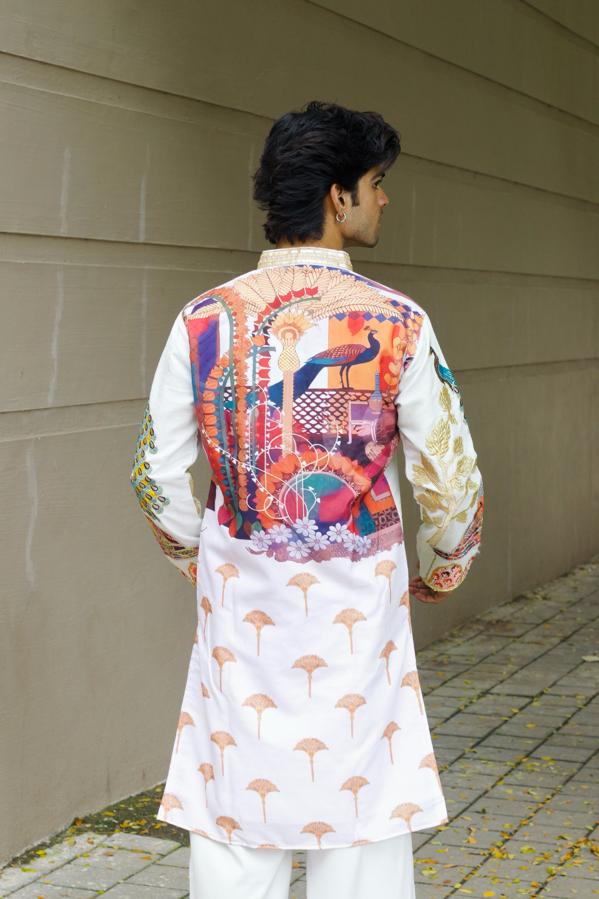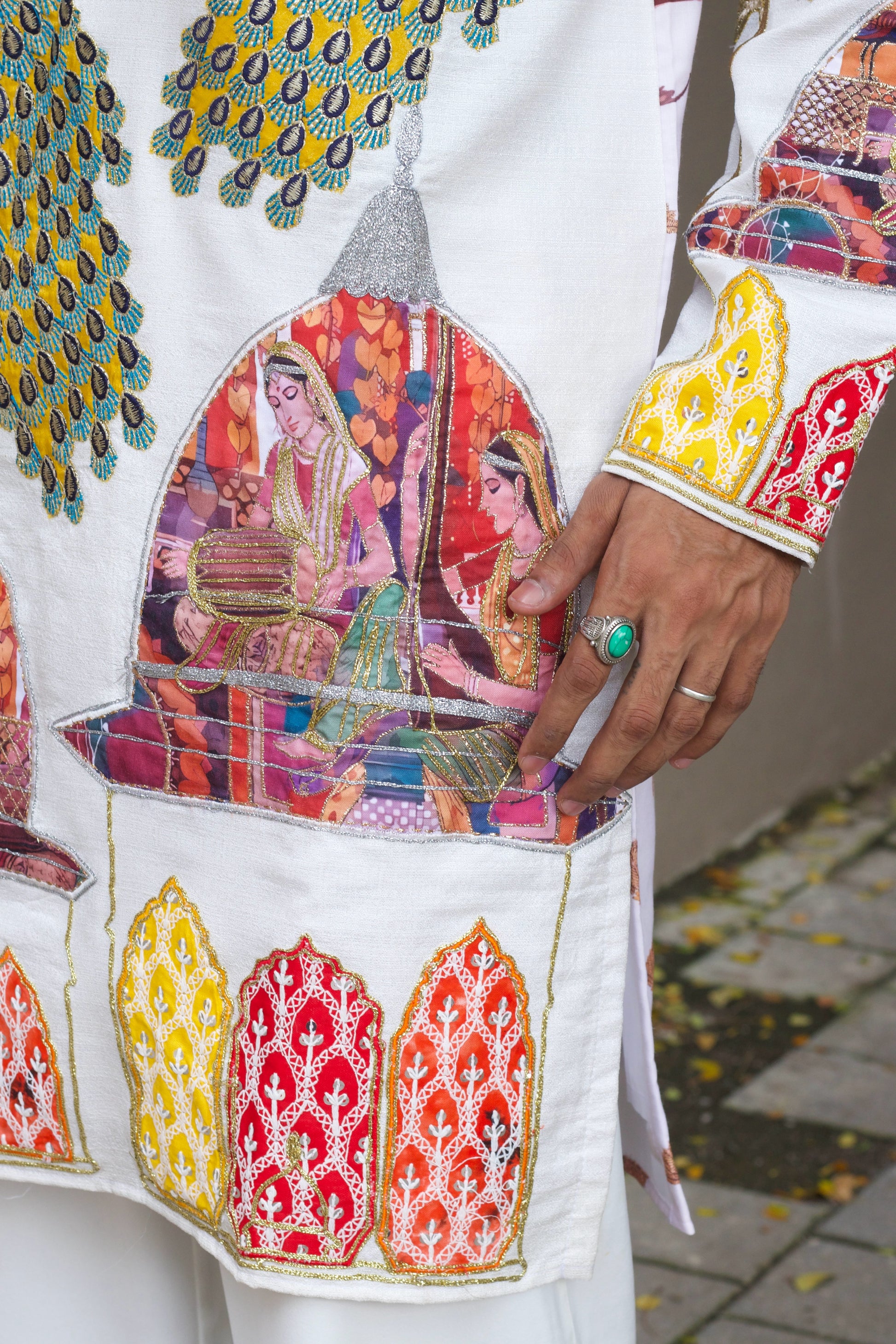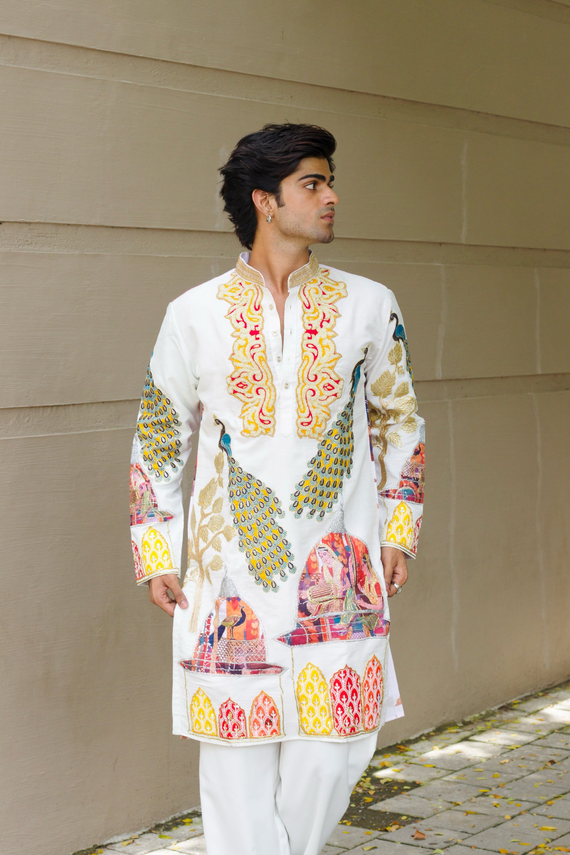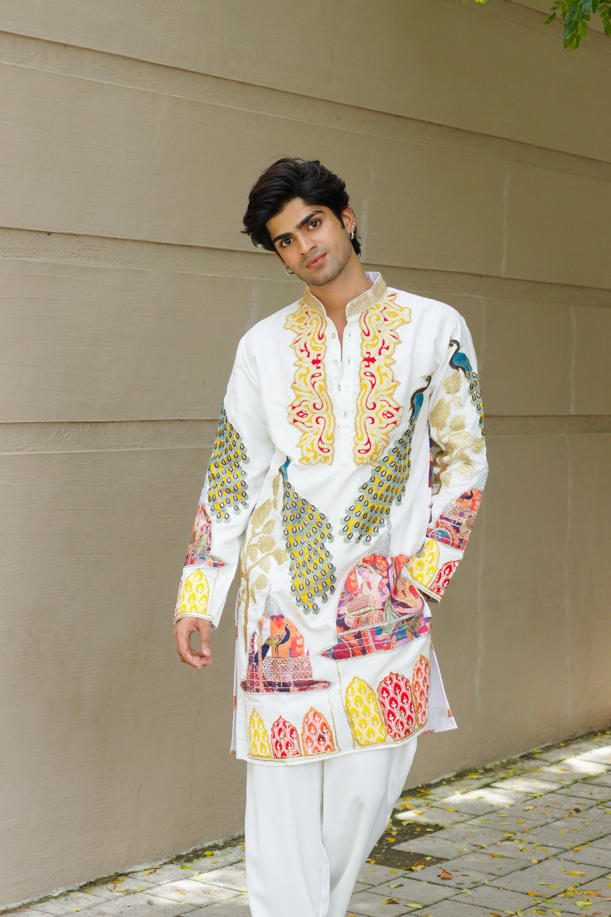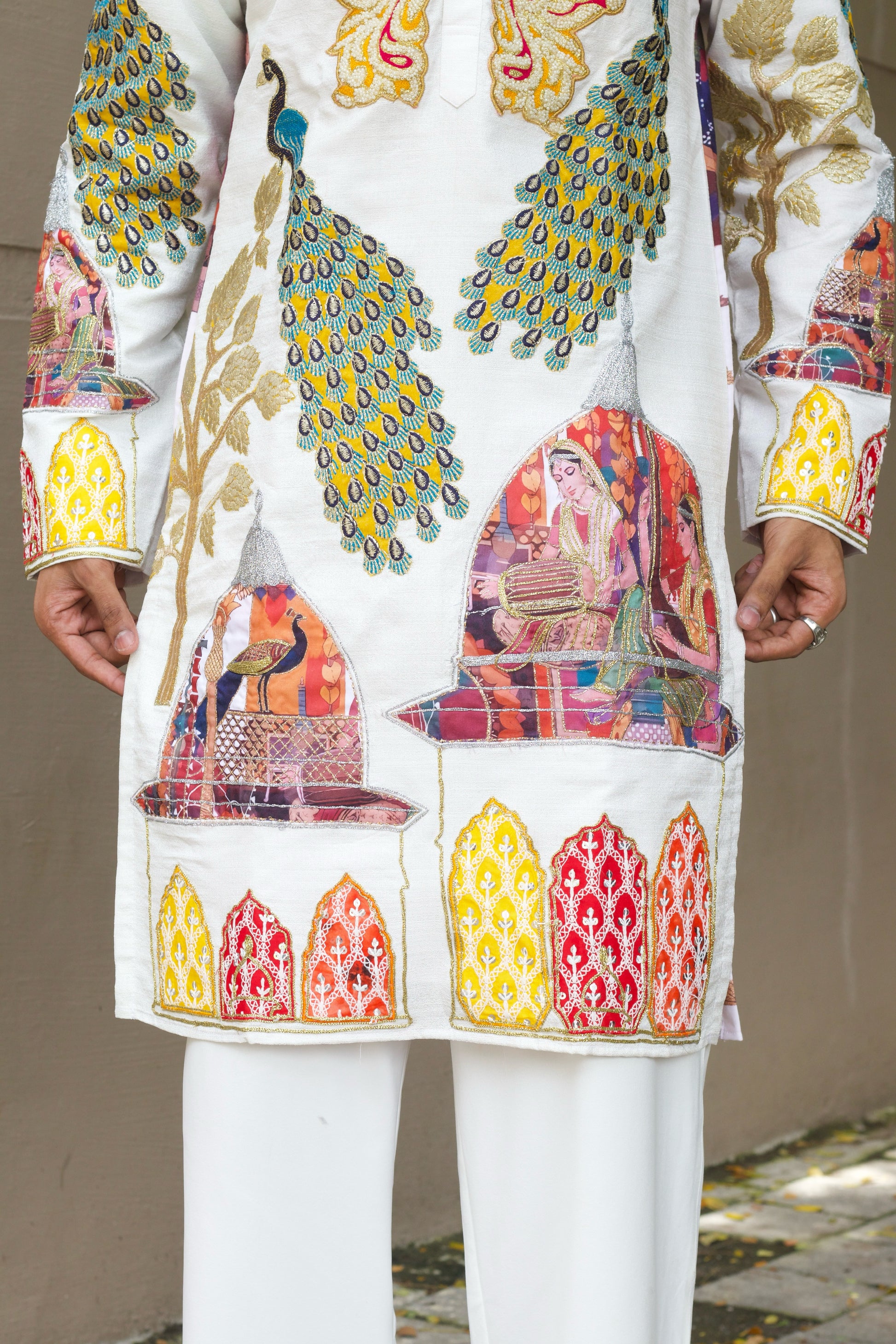 White Peacock All-Over Patch Work is a dress with peacock patch details all over. The fabric feels light. It lets air flow so you can wear it many hours without feeling stiff. The patch work adds texture without being heavy. The white base keeps the look clean. It fits well for weddings, festivals or family events. Just pair with flats and small earrings to complete the look without much fuss.