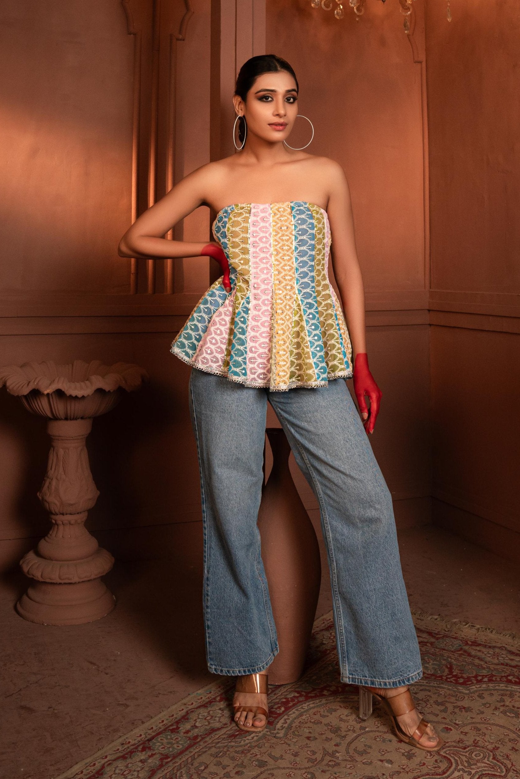 Add a pop of color to your wardrobe with this whitened colorful tunic. Crafted from lightweight and flowing georgette material, this tunic offers a perfect blend of comfort and style for various casual and semi-formal occasions.